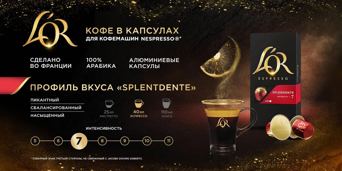Espresso Splendente, арабика Откройте для себя магию кофейного искусства и легендарное французское качество с кофе в капсулах L'OR Espresso Splendente. Отборные зерна 100%-ной арабики и средняя обжарка делают вкус эспрессо идеально сбалансированным и насыщенным. В нем отчетливо раскрываются ореховые ноты и пикантное цитрусовое послевкусие. А изысканный аромат и золотистая пенка подарят дополнительное наслаждение. В наборе L'OR Espresso Splendente 10 алюминиевых капсул для кофемашины Nespresso. Каждое утро будет бодрым, а приятная встреча наполнена ароматом любимого кофе. Способ приготовления Алюминиевые капсулы L'OR Espresso Splendente созданы специально для кофемашин Nespresso. Приготовление любимого кофе занимает считаные мгновения – достаточно вставить капсулу в систему, плотно закрыть крышку, добавить необходимый объем воды и выбрать формат чашки «эспрессо» (40 мл). После вскрытия храните упаковку с капсулами кофе L'OR в сухом прохладном месте при температуре до +25 ˚ C и относительной влажности не выше 75 %. Удовольствие в разнообразии Откройте вселенную насыщенных вкусов и ароматов L'OR. Попробуйте классическую коллекцию кофе в алюминиевых капсулах для кофемашин «Неспрессо» из 7 изысканных блендов: сладкий и сбалансированный Delizioso, ягодный Elegante, пикантный и насыщенный Splendente, пряный Profondo, фруктовый Estremo, выразительный Ristretto, плотный и яркий Forza. Или побалуйте себя соблазнительными вкусами, созданными нашими кофейными мастерами, – насыщенная ваниль, изысканная карамель и темный шоколад!