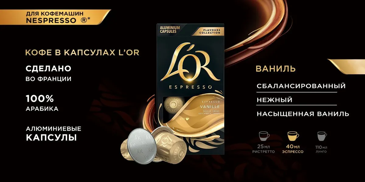 Espresso Vanilla, арабика Espresso Vanilla – кофе в капсулах для кофемашины Nespresso, который поможет вам отправиться в путешествие по миру оригинального вкуса, созданного кофейными мастерами L'OR. Безупречный бленд из 100%-ной арабики раскрывается в нежном ароматном эспрессо с богатым вкусом и тонким ароматом. Благодаря идеально сбалансированному купажу кофе L'OR в капсулах радует пикантными нотками ванили в послевкусии. Упаковка содержит 10 капсул, насладитесь удивительным вкусом и разделите его с близкими. Способ приготовления Алюминиевые капсулы L'OR Espresso Vanilla созданы специально для кофемашин Nespresso. Приготовление любимого кофе занимает считаные мгновения – достаточно вставить капсулу в систему, плотно закрыть крышку, добавить необходимый объем воды и выбрать формат чашки «эспрессо» (40 мл). После вскрытия храните упаковку с капсулами кофе L'OR в сухом прохладном месте при температуре до +25 ˚ C и относительной влажности не выше 75 %. Удовольствие в разнообразии Откройте вселенную насыщенных вкусов и ароматов L'OR. Попробуйте классическую коллекцию кофе в алюминиевых капсулах для кофемашин «Неспрессо» из 7 изысканных блендов: сладкий и сбалансированный Delizioso, ягодный Elegante, пикантный и насыщенный Splendente, пряный Profondo, фруктовый Estremo, выразительный Ristretto, плотный и яркий Forza. Или побалуйте себя соблазнительными вкусами, созданными нашими кофейными мастерами, – насыщенная ваниль, изысканная карамель и темный шоколад!