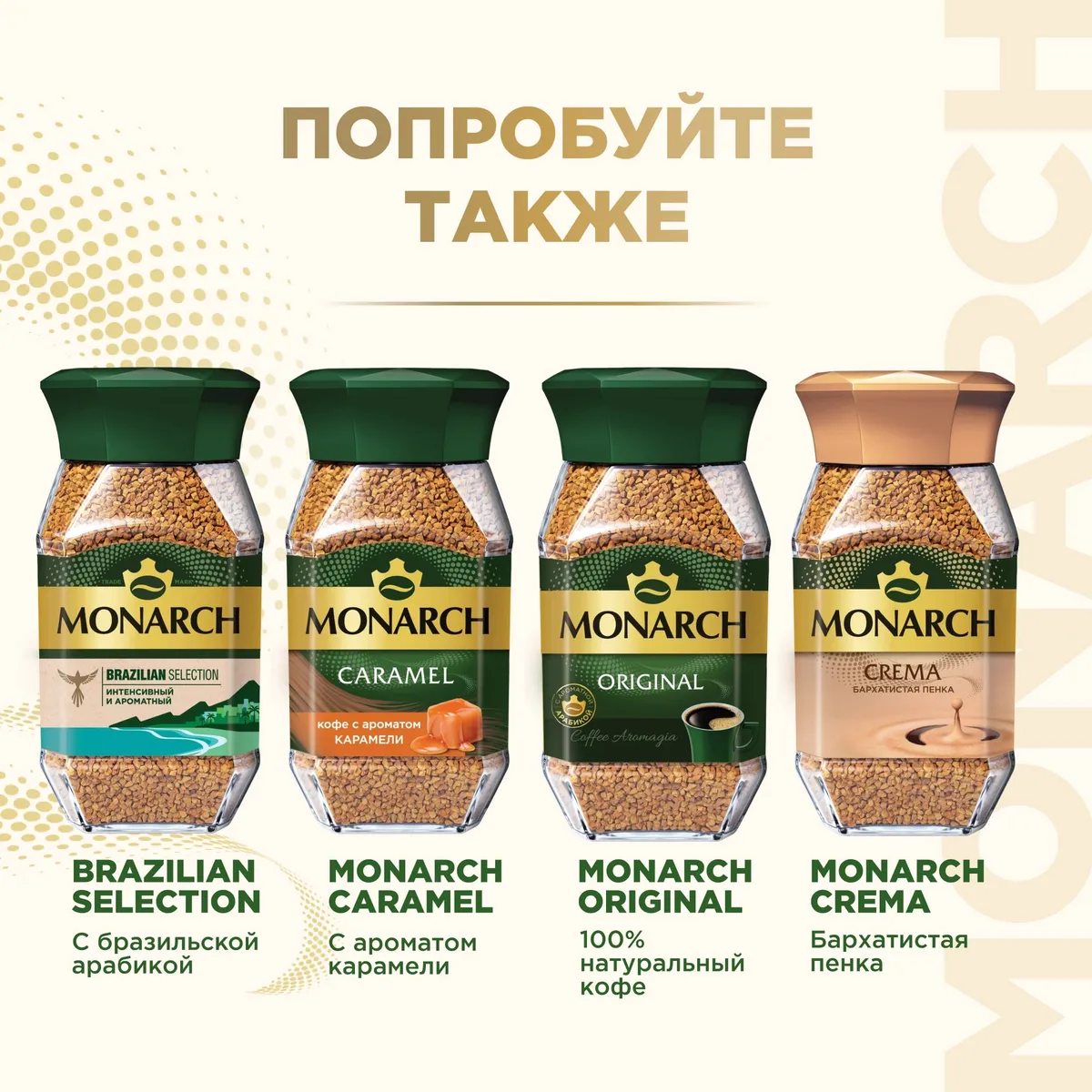 МИР МЕНЯЕТСЯ, И МЫ ВМЕСТЕ С НИМ. ВСТРЕЧАЙТЕ КОФЕ MONARCH! ВСЕ ТОТ ЖЕ ЛЮБИМЫЙ ВКУС И АРОМАГИЯ: Богатый, насыщенный вкус и волшебная сила Аромагии остаются с вами в каждой чашке кофе Monarch! Мы сохраняем высокое качество и традиции производства, чтобы вы всегда могли наслаждаться любимым кофе. ТЕ ЖЕ САМЫЕ КАЧЕСТВО И ПРОИЗВОДСТВО Наша компания всегда заботится о том, чтобы качество продукта оставалось неизменным, и потребитель мог в любой чашке кофе почувствовать тот же вкус и аромат, к которому он привык за многие годы. Эту задачу решают специалисты отдела исследований и разработки отдела качества. Рецептура нашего кофе уже более 22 лет контролируется строгими стандартами. Это контроль каждого этапа производства и всех процессов приготовления того же самого качественного кофе, который вы так любите. Чтобы обеспечить соответствие высоким стандартам компании, входной контроль качества сырья осуществляется на постоянной основе. РЕЦЕПТ АЙРИШ КОФЕ: ИНГРЕДИЕНТЫ: 300 мл воды; 3 чайные ложки кофе Monarch Gold; 2 столовые ложки (30 мл) виски; 2 чайные ложки коричневого сахара; 0,4-0,6 стакана взбитых сливок; СПОСОБ ПРИГОТОВЛЕНИЯ: Приготовьте две кофейные чашечки для напитка. Слегка взбейте сливки до состояния очень мягких пик. Положите 1 чайную ложку сахара и 1 столовую ложку виски в каждую чашку и перемешайте, пока сахар не растворится, а затем налейте кофе в каждую чашку. После нескольких минут добавьте взбитые сливки поверх каждой чашки. ПОПРОБУЙТЕ ТАКЖЕ: Monarch Brazilian Selection с зёрнами бразильской Aрабики, бережно выращенными и собранными на солнечных плантациях Бразилии и мастерски обжареными для создания неповторимого интенсивного вкуса и аромата кофе! Monarch Caramel, насладитесь аппетитным сочетанием карамельного аромата и вкуса деликатно обжаренных кофейных зёрен. Monarch Original, притягательный аромат, создающий особую атмосферу для теплого общения с вашими близкими. Monarch Crema — обогатит ваши кофейные ощущения. Впервые яркий насыщенный вкус кофе теперь с соблазнительной бархатистой пенкой. Показать полностью