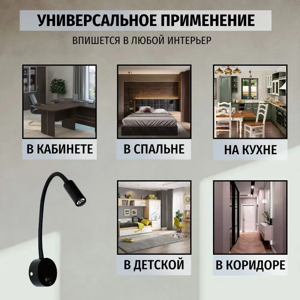 Настенный светодиодный светильник - это стильное и функциональное решение для освещения и декора вашего дома или офиса. Светильник обеспечивает равномерное и мягкое освещение, создавая комфортную атмосферу для чтения, учебы или просто отдыха. Мощность 3 Вт = 25 Вт в эквиваленте лампы накаливания, белый свет (4000 К) с нейтральным освещением, приближенным к дневному. Светильник подключается напрямую в сеть с напряжением 85–265 В, на корпусе предусмотрена клавиша включения / выключения. Блок питания встроен в корпус основания. Гибкая конструкция позволяет выбрать область свечения. Ровное свечение, отсутствие мерцания. Индекс цветопередачи Ra≥80. Светильник выполнен в черном цвете, что позволяет ему гармонично вписаться в любой интерьер. Он может быть использован как в спальне, так и в гостиной, кабинете или даже в библиотеке. В комплекте идет крепеж, что делает его удобным для использования как в домашних условиях, так и в офисных помещениях. В целом, настенный светильник - это стильное и функциональное решение для освещения и декора вашего дома или офиса.